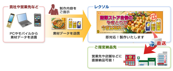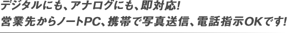 ◆地方の営業先などから、モバイルで素材データをお送りいただき、制作内容をご指示いただけば、すぐに作業を開始し、出来上がり次第、ご指定の場所へ直送が可能です。可能な限り、スピーディーに! そしてお手間を減らすために!お手伝いさせていただきます。