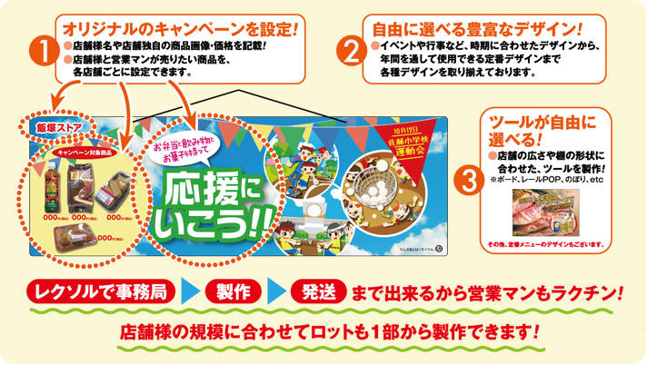 など、事前に事業部様、キャンペーンごとなどにお決めいただいたフォーマットを使用いたしますので、オリジナル部分の素材さえいただければ、すぐに制作を開始できます。