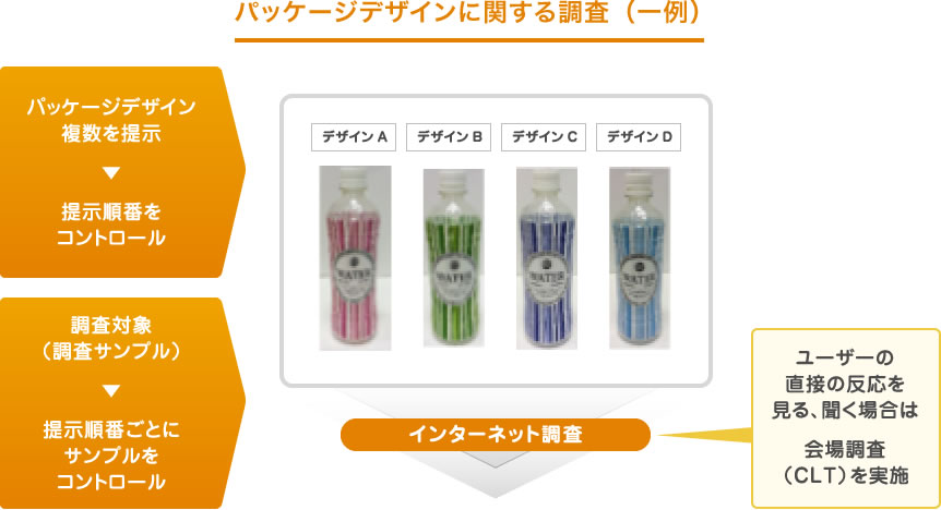 パッケージデザインの提示と調査サンプルの構成をコントロールして実施。