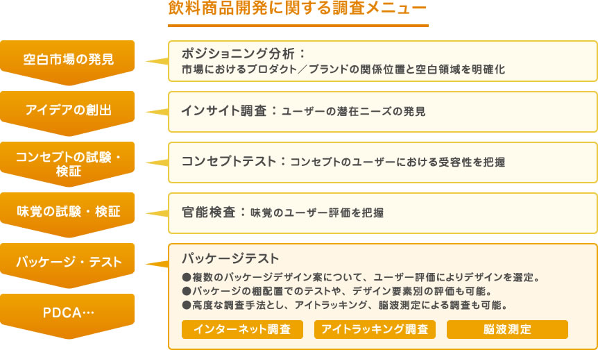 飲料の商品開発における、パッケージテストをはじめ、各ステップごとの調査が提供可能です。